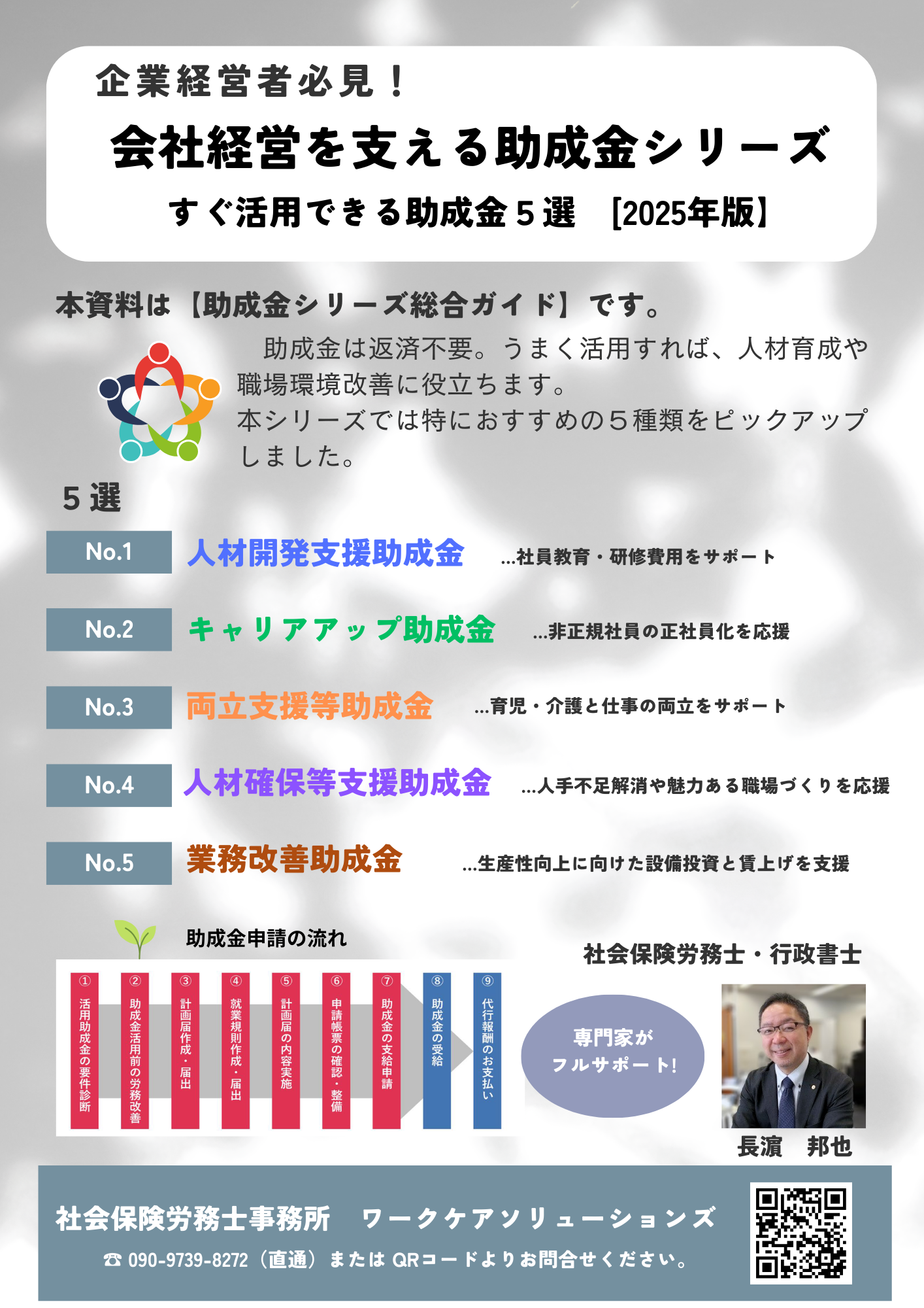 経営者の皆様からご要望の強い助成金について、「企業経営を支える助成金シリーズ」~すぐ活用できる助成金5選【2025年版】~ をリリースします。